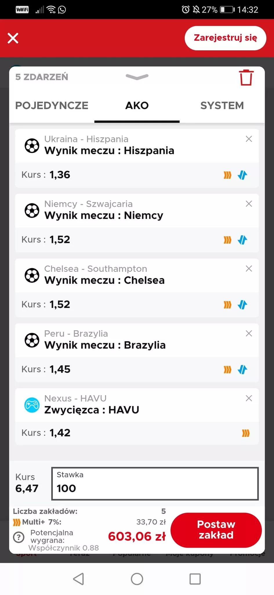 Niewątpliwym plusem apki mobilnej Betclic jest fakt, że dobór zakładów zarówno na kupony SOLO, jak i AKO przebiega praktycznie w ten sam sposób co stronie internetowej. Wystarczy więc, że wybierzecie interesującą Was dyscyplinę sportową, dane rozgrywki oraz zakład – taki typ od razu znajdzie się na Waszym internetowym kuponie. Co ważne, w ten sposób możecie szybko i wygodnie grać nie tylko zakłady z oferty pre-match, ale też typy LIVE.