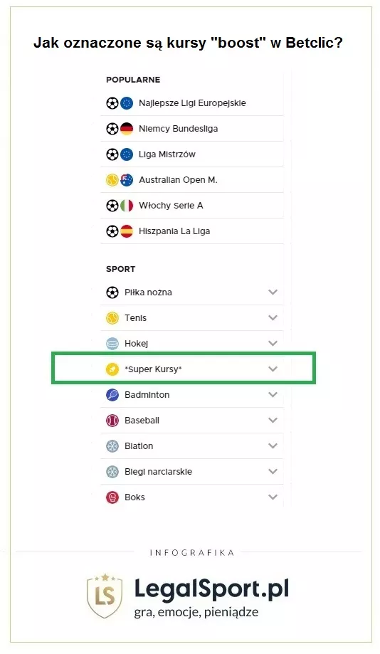 Wszystkie podwyższone kursy bukmacherskie u tego buka online znajdują się w zakładce "Super Kursy". Usytuowana jest ona w lewym panelu na stronie głównej - na www.betclic.pl - w dziale "Sport" (szukajcie po prostu rakiety kosmicznej, która jest symbolem tego działu). Tam również odszukacie inne pewne typy znajdujące się w ofercie sportowej Betclic.
