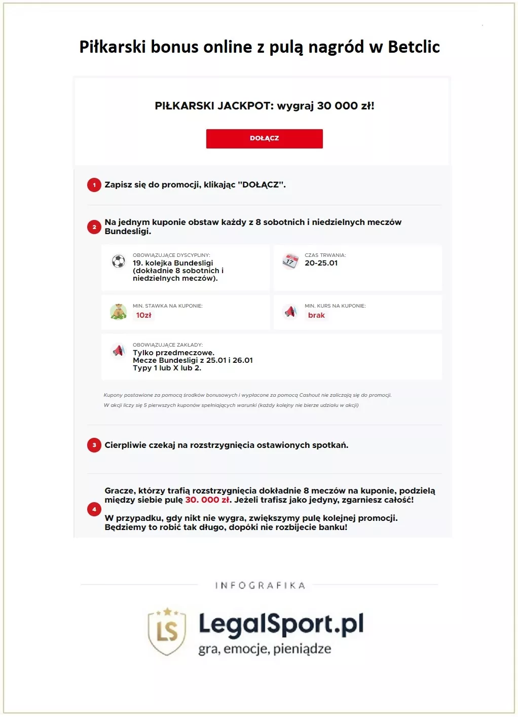 Wystartowała kolejna edycja Piłkarskiego Jackpota z pulą nagród podwyższoną do 30000 zł! Aby wziąć udział w promocji należało obstawić na jednym kuponie 8 meczów 19. kolejki Bundesligi za minimalną stawkę 10 zł. W promocji Betclic biorą udział tylko kupony ze zdarzeniami przedmeczowymi, z typami 1 lub X lub 2.