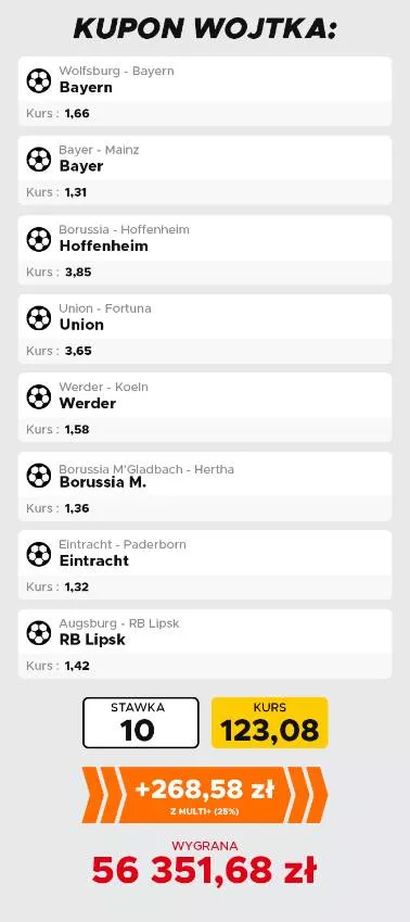 Co tydzień zadaniem Graczy było trafne wytypowanie na jednym kuponie 8 spotkań ze wskazanej ligi piłkarskiej. W przypadku braku zwycięzcy, pula była zwiększana o 5.000 zł. I wzrastała aż do minionego weekendu - kumulacja wyniosła aż 55.000 zł na edycję dedykowaną lidze niemieckiej.