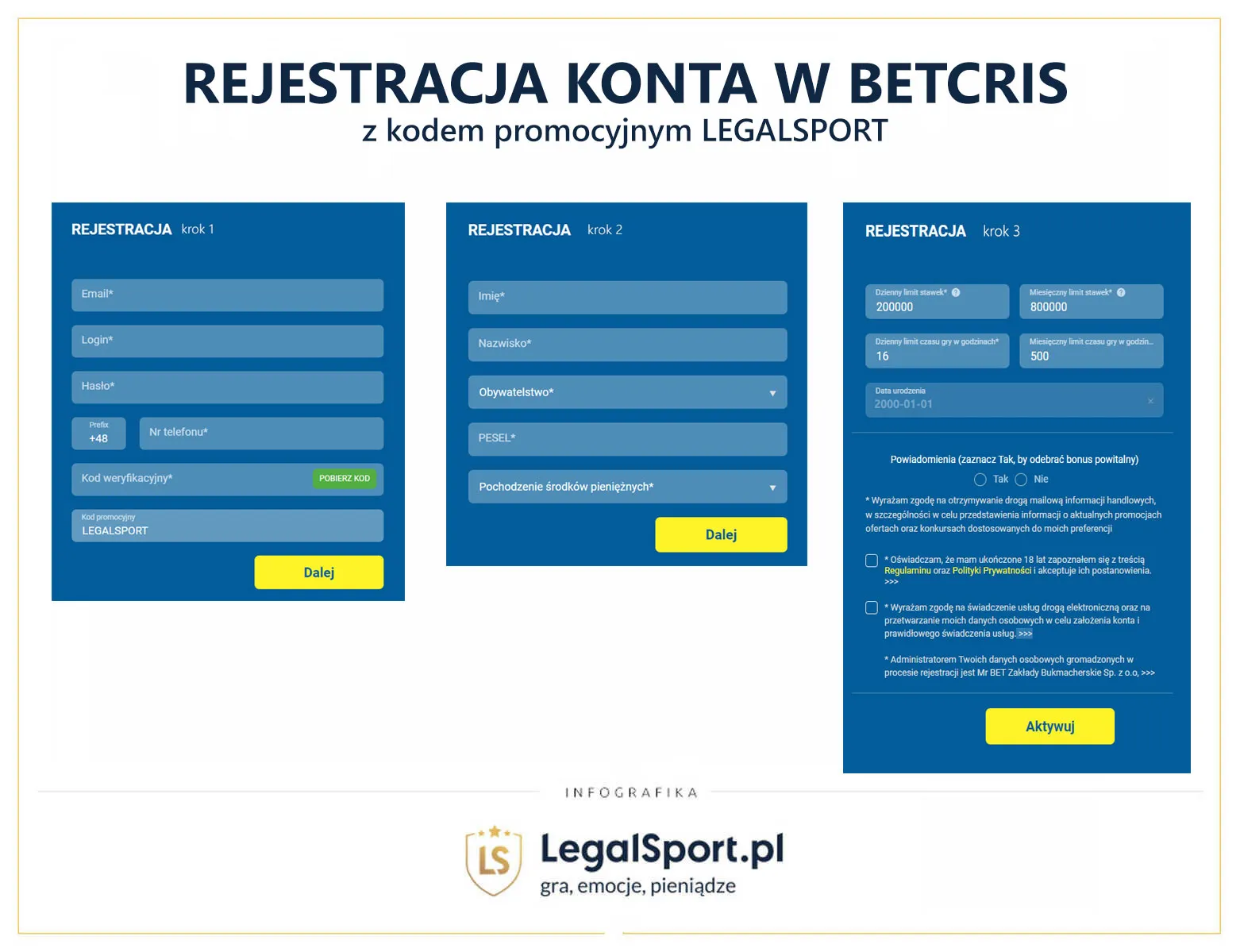 Formularz rejestracyjny nowego klienta w jest w pełni zautomatyzowany. Korzystając z naszego linka afiliacyjnego do Betcris, ułatwiasz sobie proces. Aktualny na dziś (środa, 5 listopada 2025) kod o treści LEGALSPORT będzie wpisany automatycznie i nie trzeba go ręcznie wpisywać na formularzu.