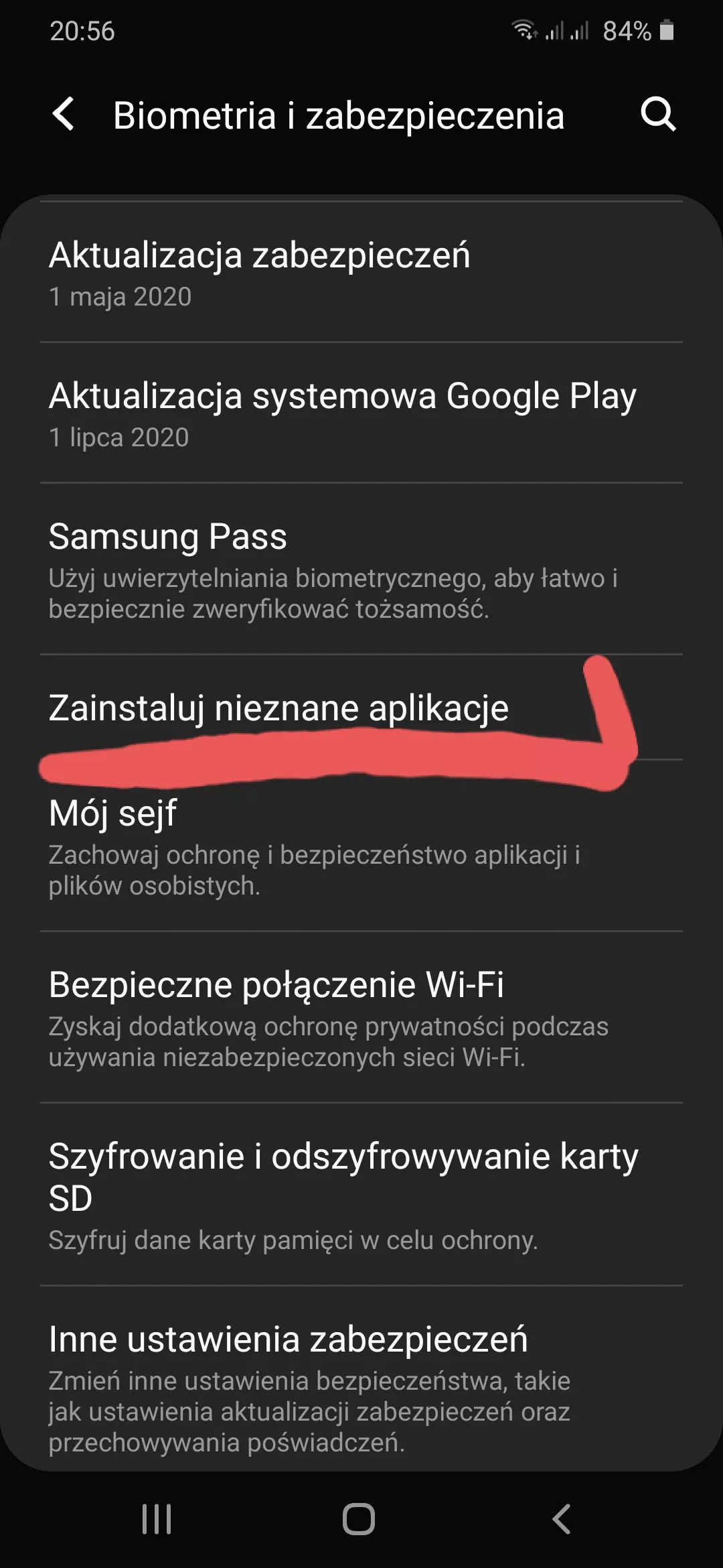 Na samym początku musimy wejść w ustawienia telefonu i zmienić jeden z parametrów. W tym celu wybierzemy ikonkę „Ustawienia”, a następnie „Bezpieczeństwo” lub „Zabezpieczenia” (w zależności od telefonu). W dalszej kolejności musimy wyszukać hasło: „Nieznane źródła” lub „Zainstaluj nieznane aplikacje” (opcja zaznaczona na poniższej grafice).