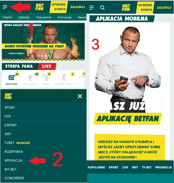Dlatego jeżeli chcecie pobrać aplikację BETFAN na Androida, należy odpalić stronę internetową buka i wejść w zakładkę „Aplikacja” (nie wiecie gdzie kliknąć? Wszystko jest zaznaczone na poniższej grafice). W dalszej części tekstu przygotowaliśmy dla Was instrukcję krok po kroku jak uruchomić aplikację na telefonach z systemem Android.