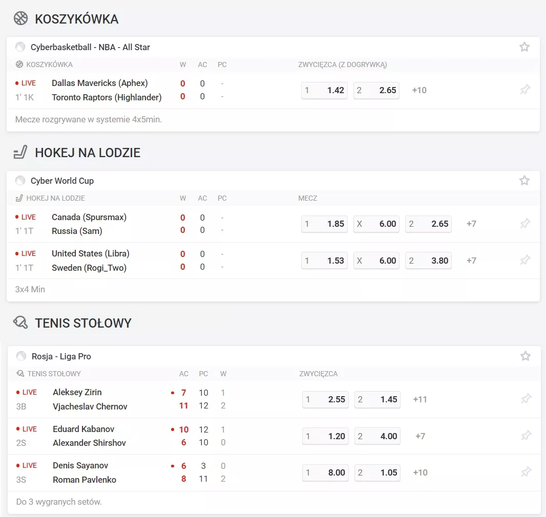 No dobrze, a jakie dokładnie typy na żywo od Superbet Zakłady Bukmacherskie warto obstawiać? Regularne zawieranie zakładów internetowych w wersji LIVE można podzielić na dwie części, które idealnie uzupełnią standardowy dzień meczowy. W godzinach porannych najlepiej puszczać kupony na e-sport oraz tenis ziemny. I tutaj najbardziej dochodowe będą typy na liczbę map - CS GO, DOTA 2, League of Legends, typy na zwycięzcę oraz typy na liczbę gemów - turnieje ATP, WTA. Poniżej możecie zaznajomić się z przykładową internetową ofertą na żywo na e-sport (koszykówka, hokej na lodzie) oraz tenis stołowy.