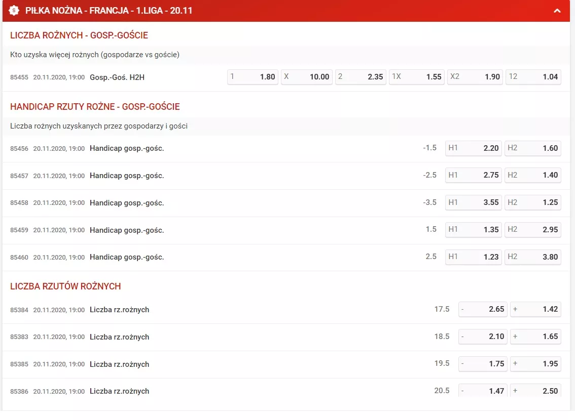 2) Typy specjalne uwzględniające całą kolejkę ligową (np. liczba rzutów rożnych w całej serii gier Ligue 1: gospodarze vs goście),