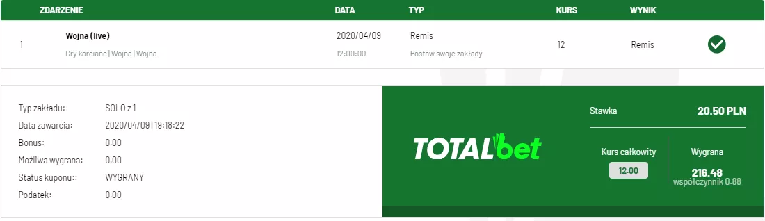Bardzo imponująca jest wygrana z trzeciego kuponu bukmacherskiego na karcianki w TOTALbet - tym razem typer postawił na remis z kursem 12 i wyłożył na taki wynik kwotę 20.50 zł. Jego wygrana wyniosła więc aż 216,48 zł!