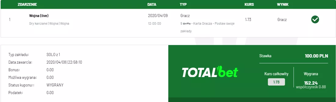 Poniżej przedstawiamy Wam wygrane kupony bukmacherskie na Karcianą Wojnę w TOTALbet - jak widać, zakłady bukmacherskie na karcianki naprawdę mogą być opłacalne! Na pierwszym kuponie typer obstawił zwycięstwo gracza po wyłożeniu pierwszej karty - była to "dziewiątka" dla Gracza, a więc jego zwycięstwo było dość prawdopodobne, a buk "wycenił" je na 1.73. Karta dla Krupiera rzeczywiście okazała się niższa, więc przy stawce 100 zł typer zgarnął 152,24 zł wygranej.