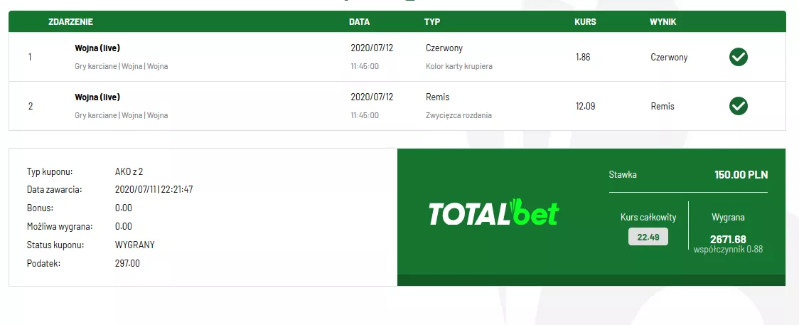 Kolejny kupon zawiera dwie selekcje na Karcianą Wojnę, z czego jedna to zakład na kolor karty Krupiera (typer obstawił Czerwony ze współczynnikiem 1.86), a druga - zakład na remis z wysokim kursem 12.09. Łączny kurs kuponu wynosi więc aż 22.48, co przy stawce 150 zł przyniosło graczowi wygraną w wysokości przekraczającej 1500 zł - dokładnie do jego kieszeni wpadło 2671.68 zł.