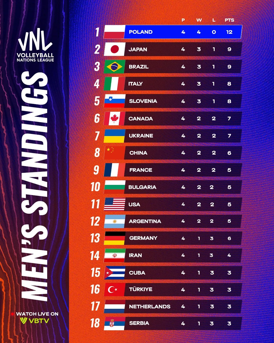 Po zmaganiach w Azji i Ameryce, reprezentacja Polski zagra ostatni z trzech turniejów grupowych przed własną publicznością. Od 16 do 20 lipca Biało-Czerwoni wystąpią w Ergo Arenie na granicy Gdańska i Sopotu. Tam poznamy ostateczny skład finałowej ósemki. Obecnie biało-czerwoni liderują w tabeli, z kompletem punktów i świetnym bilansem setów. Jeśli utrzymają formę w Chicago, awans do turnieju finałowego w Ningbo (30 lipca – 3 sierpnia) stanie się niemal pewny.