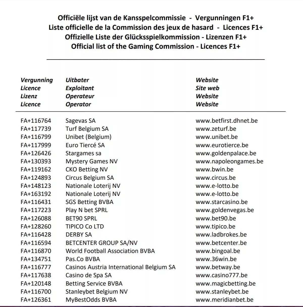 Belgowie stawiający zakłady bukmacherskie przez Internet mogą skorzystać z usług 23 licencjonowanych bukmacherów, do których należą m.in. Bwin (zobacz, czy ten buk jest legalny w Polsce), Tipico, BetWay (znany ze sponsorowania drużyn piłkarskich z Premier League - liga angielska/ekstraklasa) i Ladbrokes, a także Stanleybet, Circus czy Bet90 i Unibet (sprawdź, czy ten buk może oferować swoje usługi w Polsce). Circus posiada punkty bukmacherskie w Antwerpii, Gent, Brukseli, Charleroi, Liege i Namur.