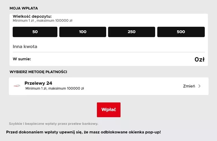 - Krok drugi: Wejdź na swój profil gracza i odpal zakładkę „wpłaty”. Wybierz konkretną metodę płatności, za pośrednictwem której przetransferujesz środki na swoje konto gracza u bukmachera. My ze swojej strony możemy polecić Ci szybki przelew bankowy z wykorzystaniem systemów Przelewy 24 lub BLIK. To bardzo wygodne i sprawdzone sposoby depozytów pieniędzy, z których korzysta większość graczy.