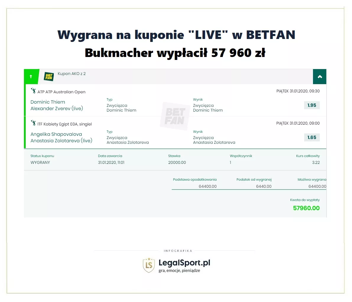 Jeśli mecz jest już w końcowej fazie, a Wy czujecie, że coś się może odmienić lub wynik jest na tak zwanym styku, to warto obstawić typ na wynik końcowy. Tak zrobił na przykład jeden z typerów, który zarejestrował się za darmo w Betfanie z naszym kodem promocyjnym [ LEGALSPORT ]. Obstawiający postawił zakład AKO składający się z dwóch typów LIVE na zwycięzcę i wygrał sporo gotówki.