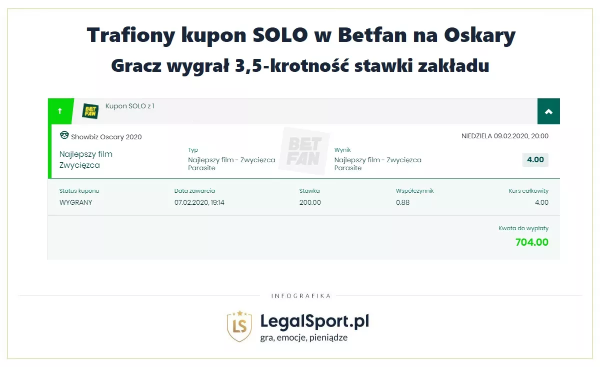 Dla potwierdzenia naszej tezy mamy trafiony kupon SOLO z mega typem na Oskary, który został zawarty w BETFAN Zakłady Bukmacherskie > pełny oskarowy zakład możecie zobaczyć powyżej. Gracz postawił 200 zł na to, że film Parasite odbierze statuetkę dla najlepszego filmu. I faktycznie tak się stało, dzięki czemu odebrał wygraną w wysokości 704 zł, co stanowi mniej więcej 3,5-krotność stawki pojedynczego kuponu.