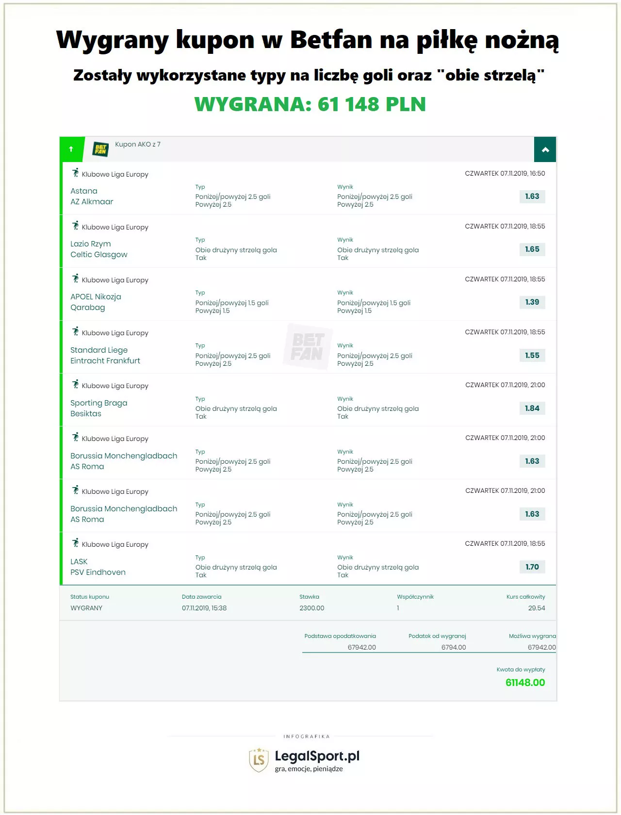Warto zwrócić uwagę również na fakt, że typujący dokooptował do zakładów na under/over również typy na BTS (Both Team Score), które zamykają pierwszą trójkę w zestawieniu najlepszych typów w BETFAN Polska. Jeśli chcielibyście postawić podobny kupon u tego organizatora bukmacherskiego, to polecamy Wam, abyście założyli tam nowe konto do gry z naszym kodem promocyjnym [ LEGALSPORT ].
