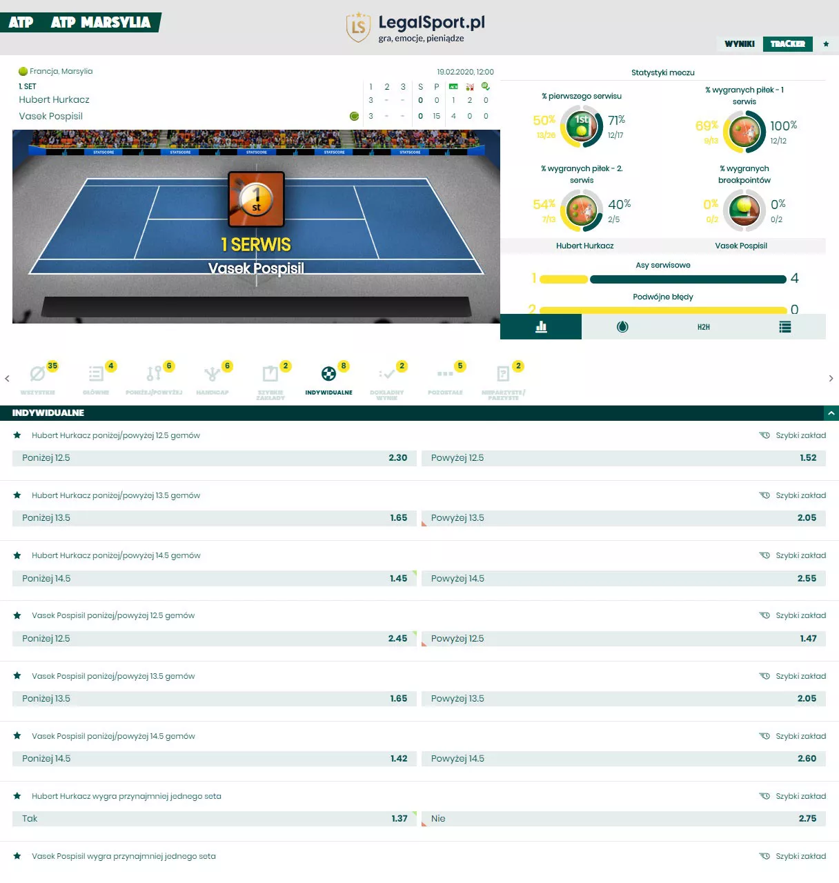 Ostatnią pozycją z tenisowej oferty "LIVE" w BETFAN, nad którą warto się pochylić, jest typ na konkretnego zawodnika. A raczej grupa selekcji, dzięki którym można wytypować wszystkie mniejsze rozstrzygnięcia po jednej ze stron. Jeśli widzicie, że tenisista X jest bez formy i nic mu nie wychodzi, albo w drugą stronę, graczowi Y wszystko wchodzi w kort i nawet system Hawk-Eye nie jest w stanie go powstrzymać, to od razu powinniście skierować się stronę zakładki "indywidualne".