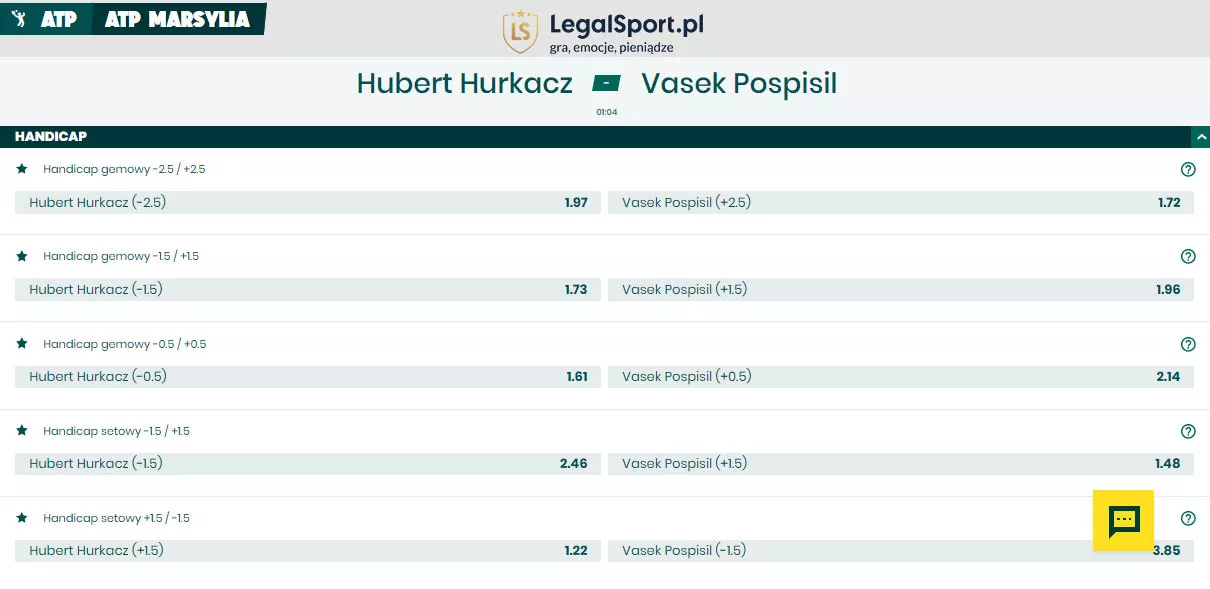 Na przykład w ramach oferty na tenis w Betfanie można obstawiać handicap gemowy oraz handicap setowy, który najczęściej jest udostępniany w kilku różnych wariantach. Powyżej możecie znaleźć wycinek betfanowskiej oferty na handi. Na marginesie możemy zaznaczyć, że równie dobre pozycje handicapowe oferują bukmacherzy LVBET, forBET oraz eWinner (w wszystkich działa nasz kod LEGALSPORT). Żeby w pełni czerpać korzyści z tego rodzaju zakładów, trzeba posiadać darmowe konta u kilku operatorów internetowych. Wówczas szybko i sprawnie można reagować na dochodowe selekcje.