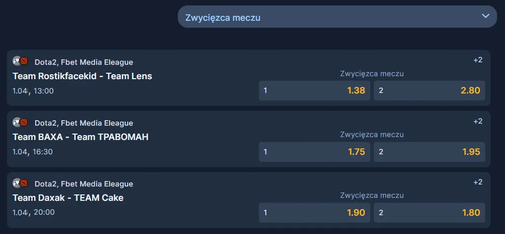Dota 2 – gra z największą zmiennością przebiegu meczu i wahaniami kursów. Mecze często kończą się comebackami, co sprawia, że zakłady LIVE mają tu szczególne znaczenie. Dostępne rynki to zwycięzca meczu, first blood, liczba zabójstw, czas trwania meczu, a przy turniejach takich jak The International – także zakłady długoterminowe na zwycięzcę całego turnieju.