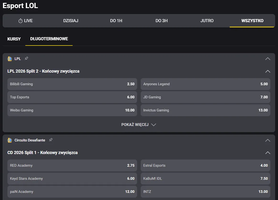 League of Legends (LoL) – druga najczęściej obstawiana gra. Mecze rozgrywane są w formacie BO1, BO3 lub BO5, ale w przeciwieństwie do CS2, każdy mecz to jedna mapa. Kluczowe rynki to zwycięzca meczu, first blood, first tower, first dragon, liczba zabójstw oraz czas trwania meczu. W ligach takich jak LEC, LCK czy LPL rynek zdarzeń to 60-80, a przy meczach fazy play-off pojawiają się dodatkowe rynki specjalne do obstawiania.
