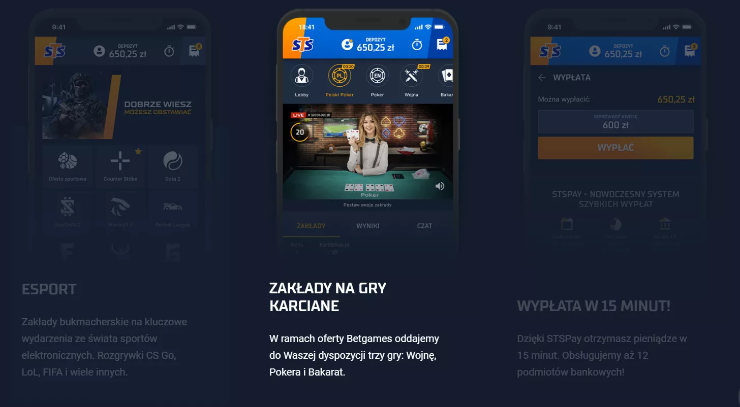 Co dokładnie mamy na myśli? Już wszystko prezentujemy. Jeżeli w ostatecznym rozrachunku zdecydujecie się na założenie darmowego konta w STS z naszym kodem promocyjnym LEGALSPORT, który działa zarówno na stronie internetowej, jak i na aplikacji mobilnej, to wtedy dostaniecie dostęp do najobszerniejszej oferty bukmacherskiej na polskim rynku. W jej skład wchodzą nie tylko tradycyjne typy sportowe w wersji prematch i LIVE czy zakłady na sporty wirtualne, ale również selekcje na gry karciane, w tym pokera, BETGAMES. Co więcej, oferta w STS nie ogranicza się tylko do pojedynczych typów.