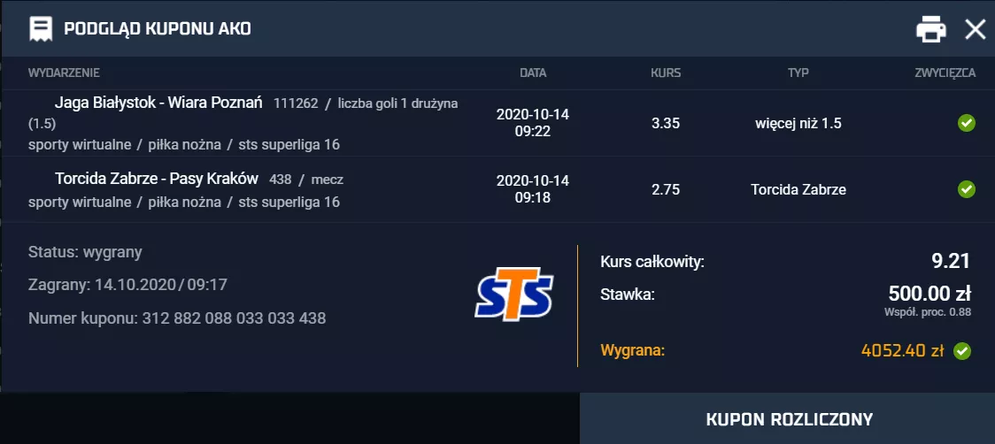 Które pozycje, ze sportów wirtualnych, godne rekomendacji mają wysokie kursy w STS? Na pierwszym miejscu są oczywiście zakłady na dokładny wynik, ale dobre współczynniki wyłuskacie również z oferty na handicap, na zwycięzcę oraz na liczbę bramek/punktów. I na potwierdzenie tych słów prezentujemy trafiony kupon na "wirtualny futbol", który przyniósł graczowi całkiem solidną wygraną na saldo depozytowe. Wygrany mega kupon na sporty wirtualne w STS znajdziecie poniżej.