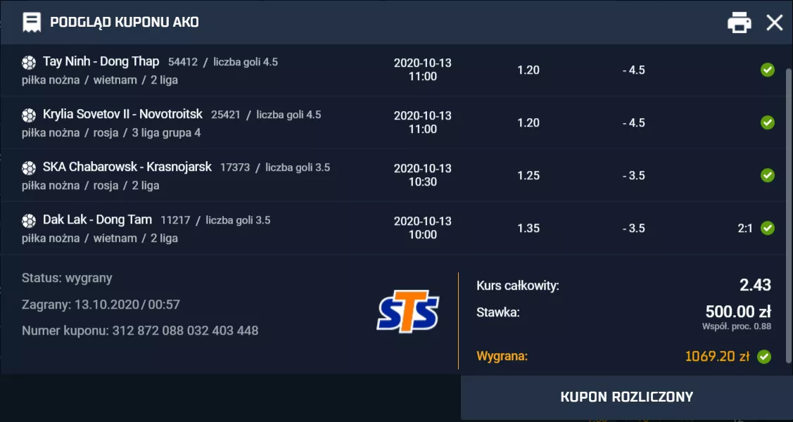 Jak bardzo dobrze wiecie, papier czy program edytorski przyjmą wszystko. Dlatego też, na potwierdzenie naszych powyższych słów, mamy dla Was przykładowy wygrany kupon w STS Zakłady Bukmacherskie, który składa się w stu procentach z polecanych przez nas typów bukmacherskich. Grający postawił na dość bezpieczny wariant, a więc pograł wysokie linie bramkowe na tak zwany minus (mniej niż x goli w meczu). Metoda ta okazała się skuteczna i dzięki temu obstawiający podwoił swój kapitał.