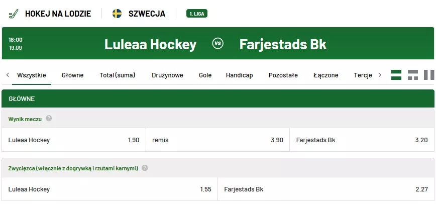 Co więcej, TOTALbet na tego typu selekcje oferuje także wysokie współczynniki bukmacherskie, i to szczególnie na faworytów. Za przykład niech posłuży tutaj mecz pierwszej ligi szwedzkiej, w którym zagra Lulea i Farjestad. I tak w TOTALbet kurs na zwycięstwo gospodarzy wynosi 1.55, a np. w Fortunie 1.51. Pamiętajcie przy tym, że to tylko jeden z wielu przykładów - wyższe kursy na faworytów w hokejowych zakładach dwudrogowych znajdziecie przy sporej liczbie selekcji, warto więc uwzględnić takie typy przy konstruowaniu swoich internetowych kuponów.