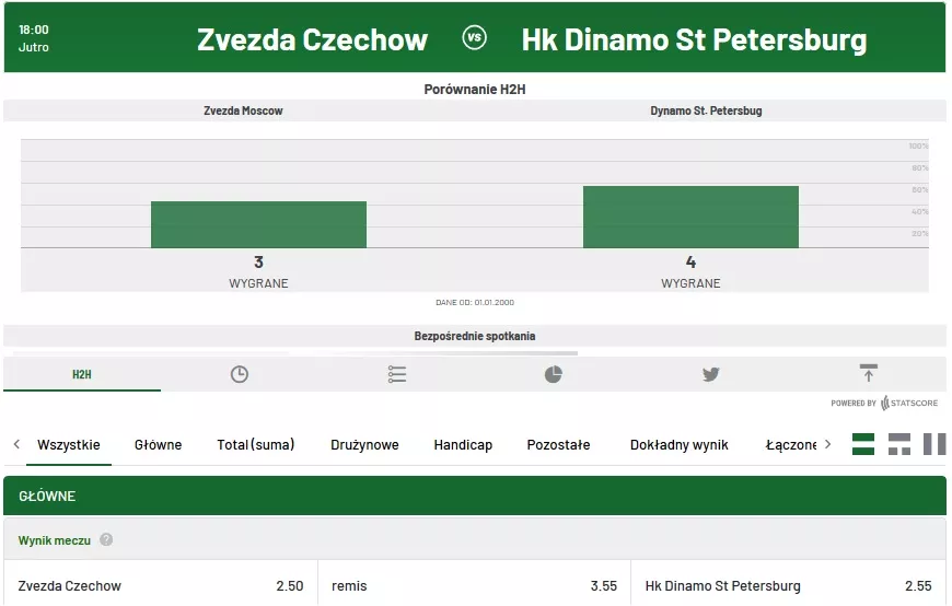 Dla przykładu weźmy tutaj zakład na zwycięstwo Zvezdy Czechow z Dynamem Sankt Petersburg, gdzie kurs na gospodarzy został ustalony na poziomie aż 2.50. Dla porównania, taki sam scenariusz w eWinner wyceniony został na współczynnik 2.44, a w STS na 2.45. Różnica jest całkiem spora, zwłaszcza jeśli taki typ planujecie połączyć z kilkoma innymi na kuponie AKO - wówczas każda przewaga kursowa ma istotny wpływ na wysokość ewentualnej wygranej. Możemy więc śmiało powiedzieć, że selekcje trzydrogowe to sprawdzone typy na hokej w TOTALbet i z pewnością warto je grać.