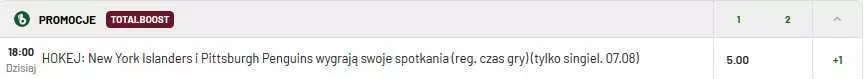 Z kolegi w promocji TOTAL Boost każdego dnia znajdziecie zakłady łączone z kursami wyższymi nawet o 40% od typów z oferty standardowej. Za przykład niech posłuży tutaj selekcja na zwycięstwo New York Islanders i Nashville Predators z kursem na poziomie 5.55.