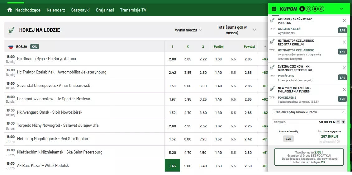 Na naszym wirtualnym kuponie umieściliśmy cztery selekcje z kursami w przedziale od 1.45 do 1.70 z kluczowych rozgrywek (NHL, KHL oraz VHL). Pierwszy z naszych typów to klasyczny zakład na trzydrogowy na wygraną, drugi to selekcja na zwycięzcę łącznie z dogrywką oraz rzutami karnymi, a trzeci to zakład na sumę goli w danej tercji. Całość zamyka typ liczbę strzałów w meczu.