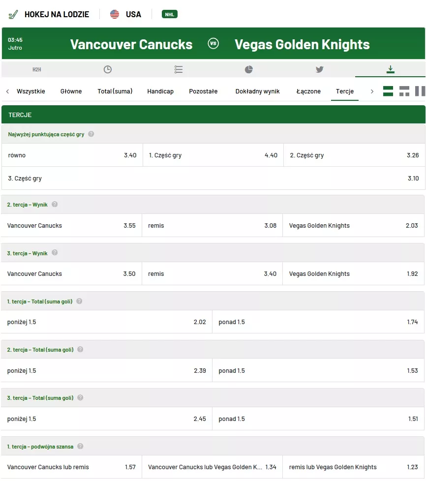 Miłośnicy hokejowych emocji w TOTALbet powinni zwrócić uwagę także na zakłady na poszczególne tercje, które obejmują naprawdę sporo możliwości. I tak np. mecz Vancouver Canucks z Vegas Golden Knights opatrzony został blisko trzydziestoma podtypami. Liczba ta robi tym bardziej wrażenie, jeśli porównamy to z ofertą buka PZBuk – zaledwie kilka selekcji oraz STS (kilkanaście zakładów).