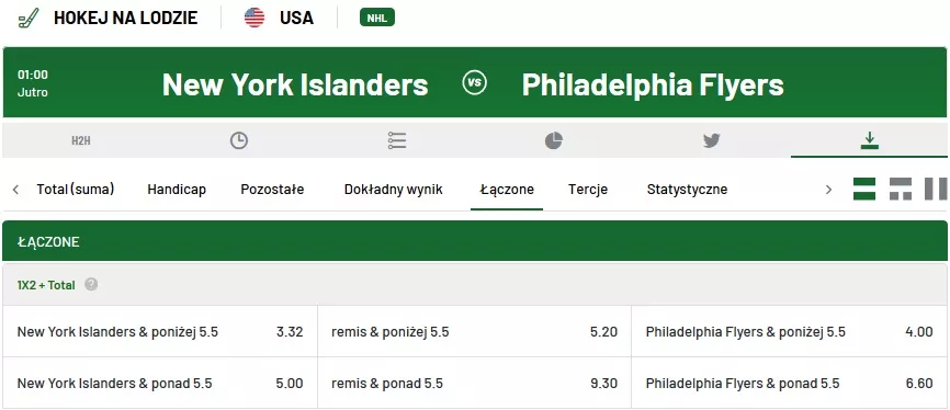 Jak już wspomnieliśmy, TOTALbet każdego dnia oferuje naprawdę rozbudowaną ofertę na mecze hokejowe. Idealnie oddają to typy statystyczne oraz łączone, których próżno szukać u wielu innych licencjonowanych operatorów zakładów wzajemnych. Doskonałym przykładem tego typu selekcji jest mecz amerykańskiej ligi hokejowej NHL pomiędzy New York Islanders a Philadelphią Flyers.