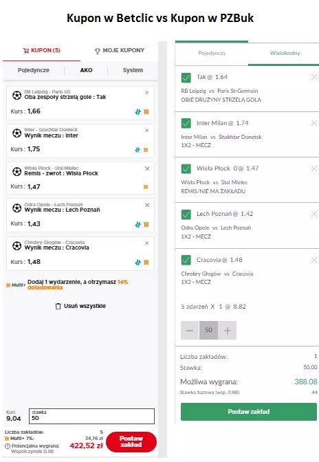 Przy stawce 50 zł i kursie całkowitym 9.04 nasza wygrana w Betclic może wynieść 397,76 zł. Ale to nie wszystko! Nasz kupon kwalifikuje się do bonusu Multi+ na kupony AKO, dzięki czemu nasza wygrana powiększy się o 7% (dodatkowe 24,76 zł) i wyniesie aż 422.52 zł. Co więcej, kupon z takimi samymi selekcjami i taką samą stawką stworzyliśmy w PZBuk – tam Wasz zysk będzie niższy o dokładnie o 34.44 zł (wygrana 388.08). Jak widać, piłkę nożną naprawdę opłaca się typować w Betclic!