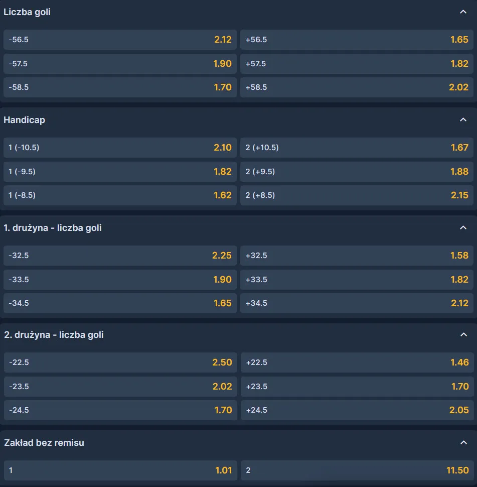 Coraz ciekawszym wyborem są również gole jednej drużyny. To rynek bardzo praktyczny, gdy dobrze oceniamy potencjał ofensywny jednej strony, ale nie chcemy opierać się na całym wyniku spotkania. Jeżeli zespół regularnie dochodzi do określonego pułapu bramkowego, a jego styl jest powtarzalny, ten rynek potrafi być bardzo użyteczny. W ofertach LV BET, ETOTO i forBET publicznie widać właśnie takie elementy: sumy goli drużyny, handicap, 1X2, parzyste/nieparzyste i zakłady połowowe.