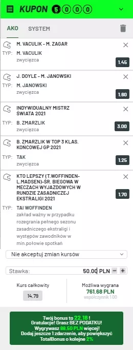 Co ważne, dzięki umieszczeniu pięciu zdarzeń na naszym kuponie AKO zyskaliśmy dodatkowy bonus w postaci 3% wygranej (promocja TOTAL Bonus). Warto zaznaczyć, że na nasz kupon przeznaczyliśmy stosunkowo niską stawkę, bo 50 zł, a i tak liczyć możemy na nagrodę o wartości 761.68 zł – chyba przyznacie, że o taką kwotę warto zawalczyć, prawda?