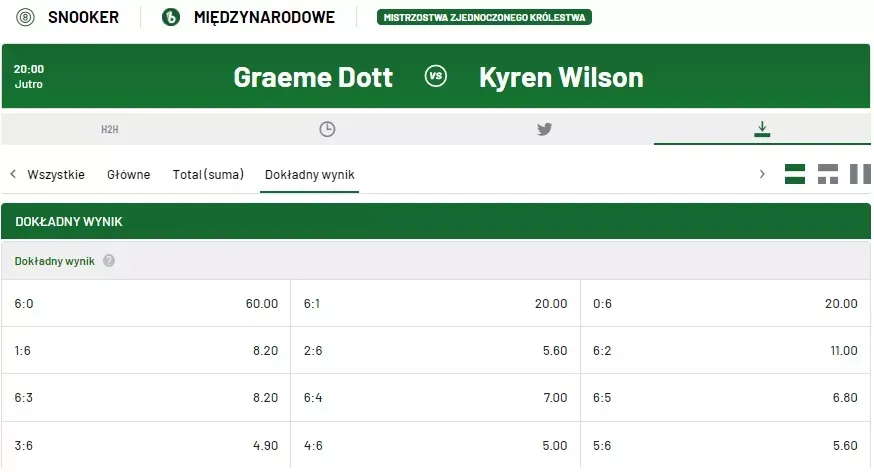 W standardowym meczu do 6 wygranych frejmów bukmacher może wystawić od kilkunastu do kilkudziesięciu rynków na bilard angielski. Oprócz podstawowego zakładu snookerowego na zwycięzcę meczu dostępne są linie handicapowe, dokładny wynik, liczba frejmów powyżej lub poniżej określonej granicy, a także rynki bardziej szczegółowe, jak zwycięzca pierwszego frejmu czy najwyższy break w spotkaniu. W turniejach najwyższej rangi oferta może obejmować nawet kilkadziesiąt wariantów na jeden mecz, co pozwala dobrać poziom ryzyka do własnej strategii.