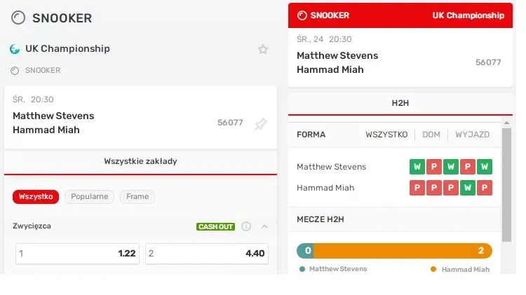 Zakłady bukmacherskie na snooker dostępne są u wszystkich największych polskich bukmacherów. Oferta zdarzeń obejmuje zarówno zakłady przedmeczowe, jak i rozbudowane rynki na żywo, w których kursy aktualizowane są po każdym frejmie, a nawet w trakcie jego trwania. To właśnie ta dynamika sprawia, że snooker jest sportem wyjątkowo przyjaznym dla gracza, który chce analizować przebieg spotkania i reagować na bieżąco.