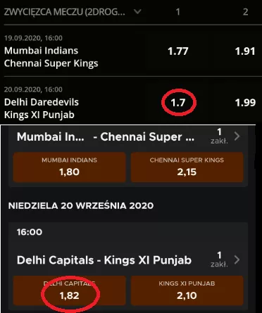 Pierwszy mecz to Mumbai Indians-Chennai Super Kings, gdzie na wygraną gospodarzy w Betclic zagramy po kursie 1.80, zaś w LV BET 1.77. Jeszcze większa dysproporcja widoczna jest przy współczynniku na gości, ponieważ różnica wynosi aż 24 groszy (2.15/1.91). Drugi pojedynek to Delhi Daredevils – Kings XI Punjab i przy okazji tego meczu zróżnicowanie kursów jest także bardzo widoczne.