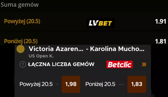 Przykładowo w starciu W. Azarenki z K. Muchovą zakład na powyżej/poniżej 20.5 gemów w meczu jest wyceniony na odpowiednio: 1.98/1.83 w Betclic i 1.91/1.81 w LV BET. To kolejne 7 i 2 grosze przewagi oficjalnego sponsora polskich siatkarzy.