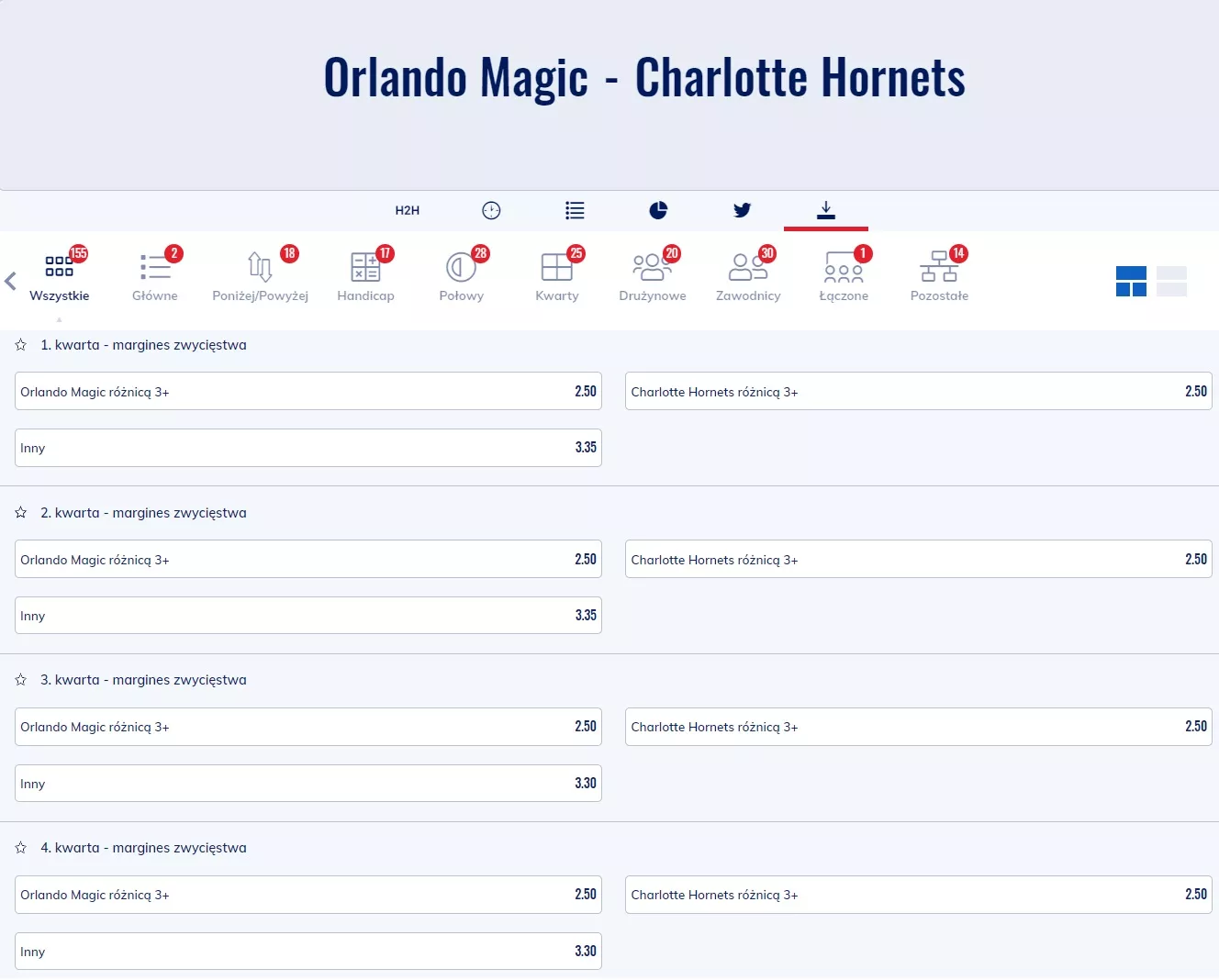 Sporą popularnością w koszykówce cieszą się także zakłady na tzw. margines zwycięstwa - przybliżając to liczbowo, co trzeci typer na swój indywidualny kupon na basket wrzuca przynajmniej jedną selekcję na różnicę punktową. Te pozycje polegają na wskazaniu różnicy w punktach po zakończeniu pojedynku lub po danym jego fragmencie. Tym samym obstawiając, że drużyna X okaże się lepsza od rywala o 7-9 punktów liczyć musimy na spotkanie, które w konsekwencji zakończy się np. wynikiem 94:86. Na poniższym screenie możecie sprawdzić, jak w praktyce wygląda oferta z typami na różnicę pkt.