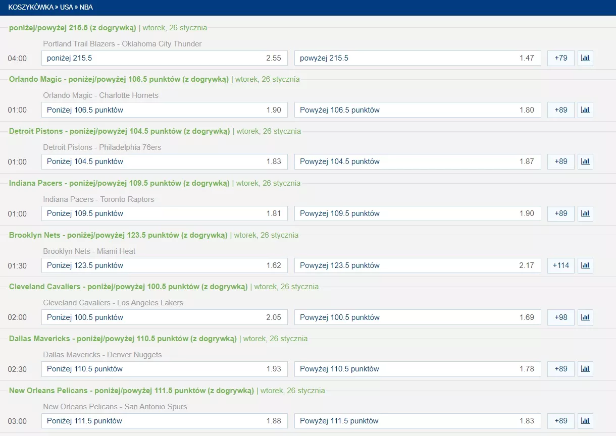 Propozycja dotycząca zakładów typu poniżej/powyżej wpaść powinna w oko przede wszystkim klientom bukmachera forBET, który nie tylko wyjątkowo wcześnie ją uzupełnia (co jest bardzo ważne z perspektywy regularnego wygrywania), ale dba także o jej różnorodność. I tak u sponsora głównego piłkarskiego Śląska Wrocław obstawiać można jak prezentować się będzie sytuacja w punktach w danych połowach, kwartach, ale również całym pojedynku.
