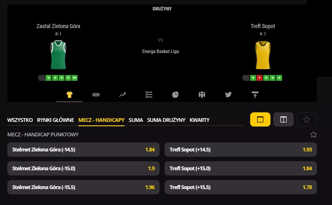 Entuzjaści tzw. dawania forów słabszym zespołom z pewnością zadowoleni będą z oferty bukmachera eFortuna, który cyklicznie raczy swoich klientów nielimitowaną promocją na grę bez podatku (można ją aktywować po rejestracji z kodem LEGALSPORT). Ten buk proponuje regularnie akurat w zakresie handicapów całkiem sporo. Mowa tutaj bowiem zarówno o handicapach na cały mecz, jak również tych dotyczących danej połowy lub kwarty. Oczywiście w każdym z podanych przykładów punkty można dodawać (najczęściej teoretycznie słabszej drużynie) oraz odejmować (najczęściej mocniejszej stronie).