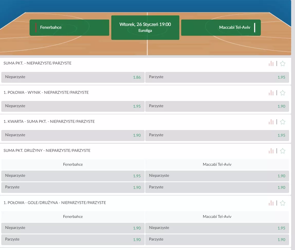 Niejednokrotnie do kuponów bukmacherskich dopisywane są również koszykarskie zakłady dotyczące wyniku, a dokładniej czy będzie on parzysty czy nieparzysty. Należy tutaj zaznaczyć, że przy tego typu zakładach liczy się tak naprawdę już tylko szczęście i nawet nie trzeba przeprowadzać choćby pobieżnej analizy. Plusem takiego działania są niewątpliwie kursy, które najczęściej wynoszą 1,85 lub 1,90, a więc jest o co grać.