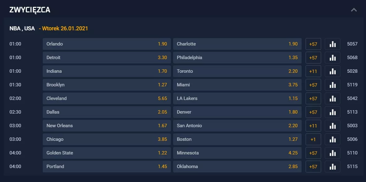 Gracze najczęściej stawiają m.in. zakłady na zwycięzcę, handicapy oraz typy na liczbę punktów. Najchętniej robią to na zakładach SOLO oraz AKO (double oraz treble). Pełna lista najpopularniejszych zakładów.