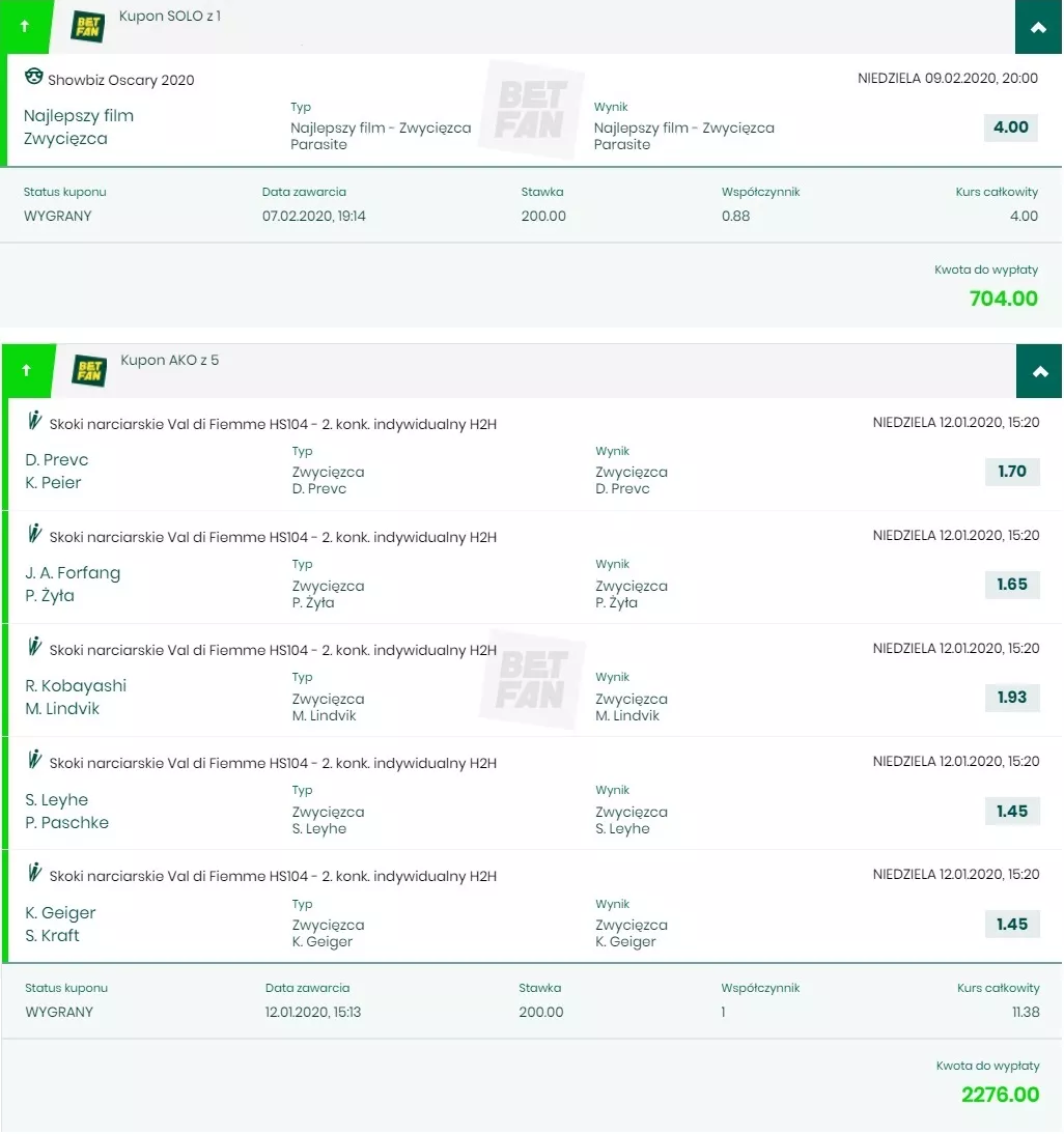 Tym razem obstawiający ograli bukmachera BETFAN. Pierwszy kupon to zakład SOLO na Oskary, natomiast drugi w stu procentach składa się z typów na skoki narciarskie. Oba przykłady pokazują, że warto stawiać mecze, zawody lub wydarzenia, w których gracz czuje się jak przysłowiowa ryba w wodzie. Przy okazji zaznaczamy, że typy na skoki narciarskie w edycji H2H to typy 2-drogowe, które śmiało może stawiać początkujący gracz.