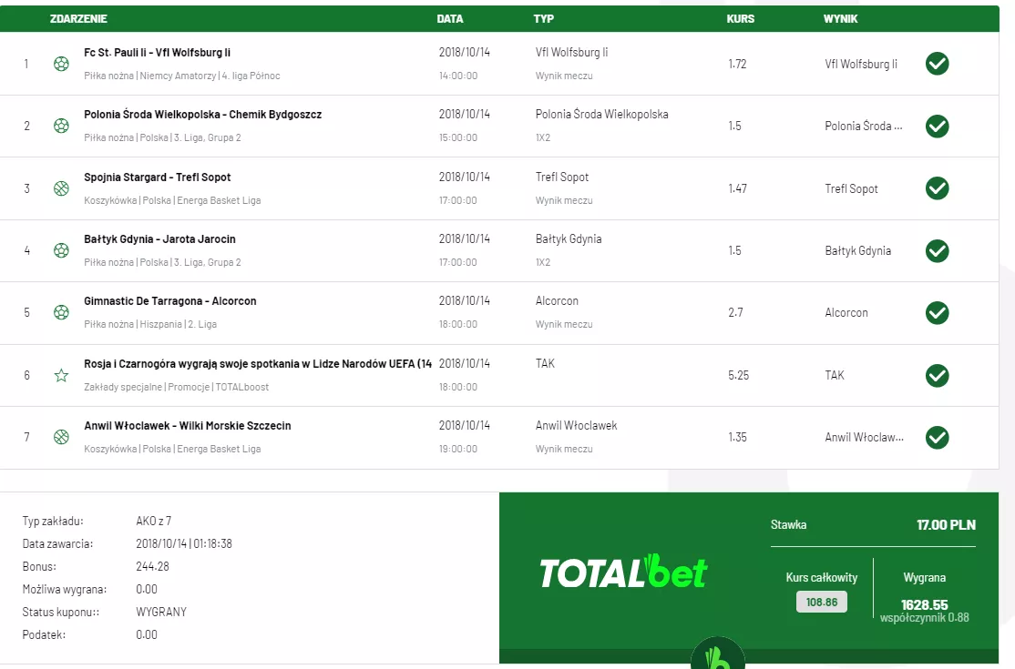 Poniżej masz natomiast przykład rozbudowanego zakładu kombinacyjnego (inaczej akumulowany) w TOTALbet. Taki kupon możesz zawierać, jak tylko złapiesz ostatni poziom wtajemniczenia. Jeżeli nie są Ci już straszne żadne typy, wiesz co to jest handicap, over/under, valuebet, system ciągu Fibonacciego czy system Greenwood, i umiesz je rozsądnie rozmieścić na kuponach, to z czystym sumieniem możesz się wziąć za takie kupony obstawiane przez internet.