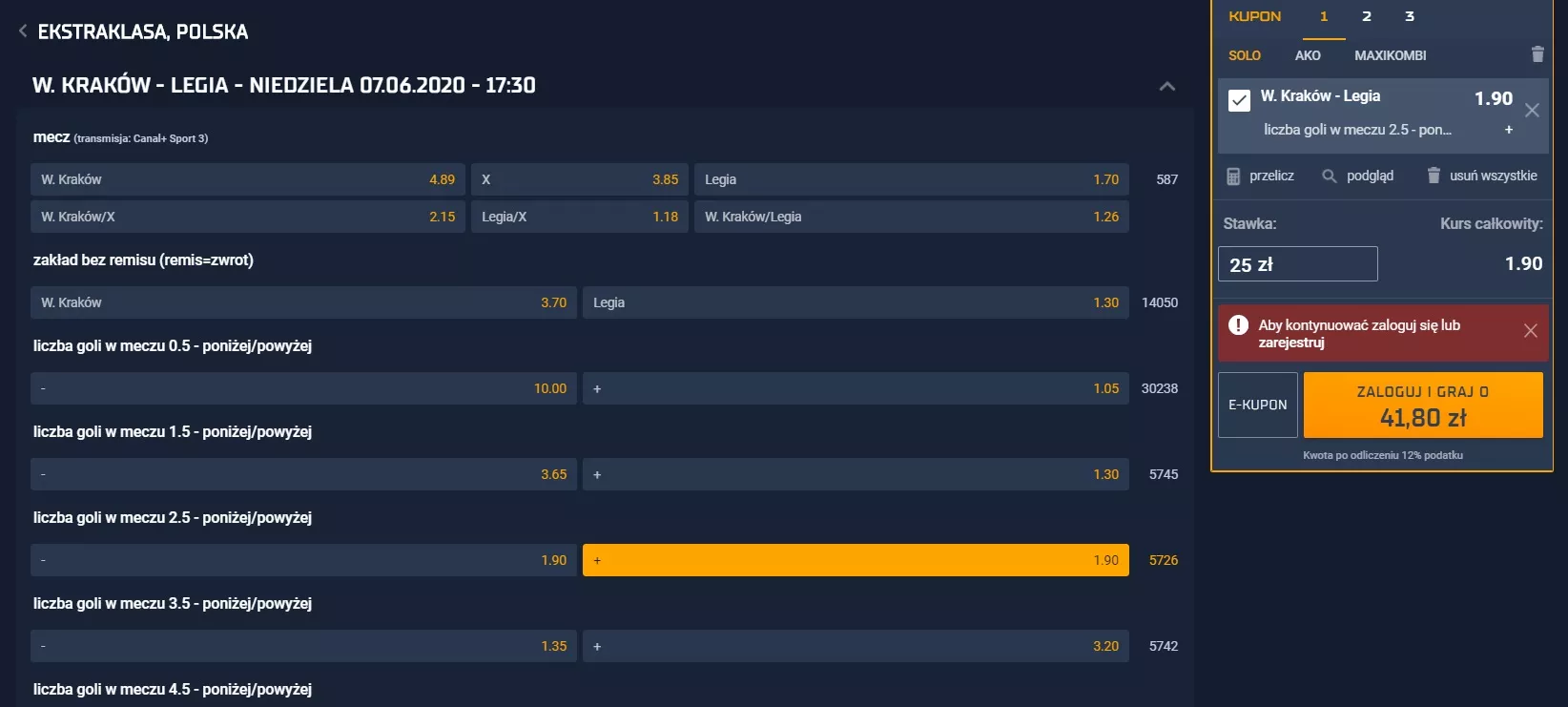 Żeby wbić typ na podglądowy kupon, znajdujący się po prawej stronie na fotce, musisz najechać myszą na kurs i kliknąć lewy przycisk myszy. Wówczas selekcja przeniesie się na kupon. I teraz ważne. Jeżeli chcesz zawrzeć zakład z jednym typem (inaczej SOLO), to wówczas wybierasz stawkę, na przykład 25 zł, i klikasz żółty baner z potencjalną kwotą do wygrania. Natomiast, jeżeli chcesz postawić zakład składający się z kilku typów (inaczej AKO/KOMBI), to po wbiciu selekcji na kupon przechodzisz do innej ligi/spotkania i powtarzasz czynność z dodaniem współczynnika (inaczej kurs).