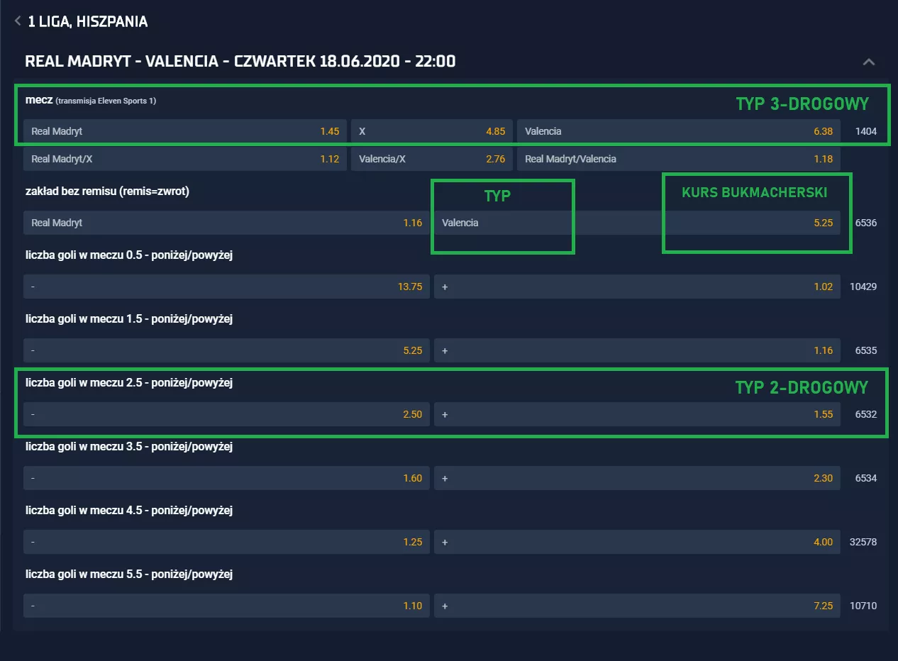 Jeżeli chodzi o ofertę zakładów sportowych, to ogólnie najważniejsza jest jej obszerność. Liczą się również przypisane do niej kursy bukmacherskie (wyższy kurs = wyższa wygrana - więcej o współczynnikach znajdziecie poniżej). Im więcej dostępnych pozycji, tym większa szansa, że znajdziesz swoją idealną selekcję dają zysk. Na początku rekomendujemy, abyś pewniaków szukał w spotkaniach, które są opatrzone minimum 50 typami. Liczba z dostępnymi selekcjami zawsze wyszczególniona jest po prawej stronie, tuż obok kursów na 1X2.
