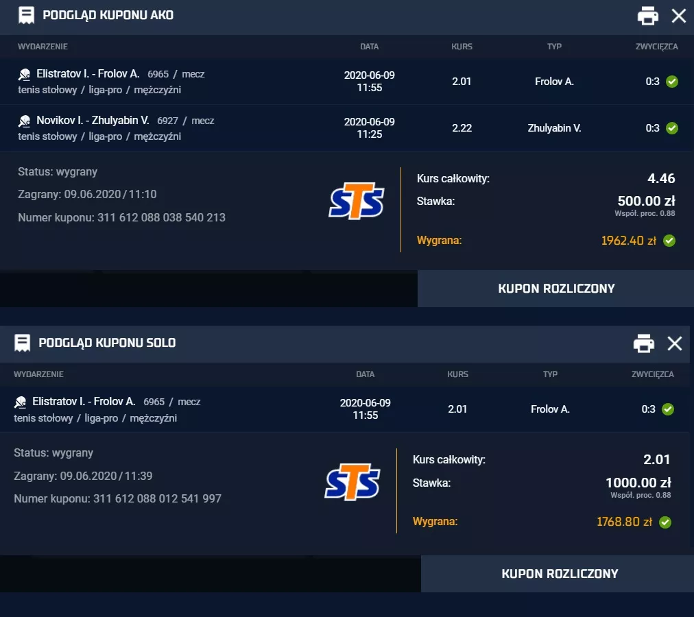 Zaczynamy od prezentacji dwóch trafionych kuponów przez \graczy w STS na tenis stołowy, które idealnie wpisują się w rolę początkowych zakładów. Szczególnie wartościowy dla Ciebie powinien być drugi kupon. Jest to zakład SOLO (pojedynczy), a więc ten, od którego powinieneś rozpocząć swoje typowanie. Stawką się w ogóle nie przejmuj, ponieważ na początku Twojej drogi nie ma ona w ogóle znaczenia (raczej swój wzrok skieruj w stronę kursu całkowitego).