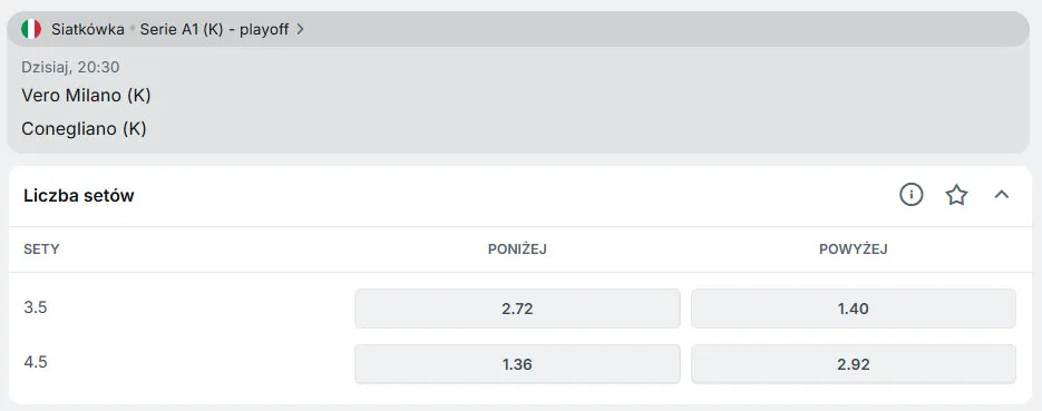 Na kuponie z zakładami na siatkę widać to wprost. Zamiast jednego kursu na zwycięstwo pojawiają się wartości powiązane z przebiegiem meczu, inne dla 3:0, inne dla 3:1, inne dla 3:2. To dlatego w siatkówce tak duże znaczenie ma nie tylko wybór drużyny, ale też wybór układu setów, który chcesz obstawić.
