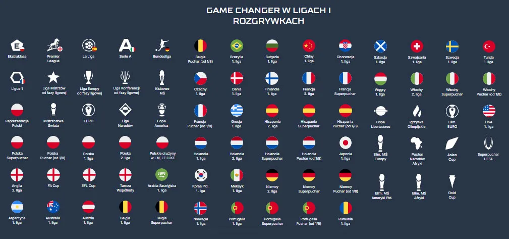 Poniżej znajdziesz pełną listę lig, pucharów i turniejów, na które STS udostępnia funkcję Game Changer. To rozległy katalog obejmujący 79 rozgrywek, potwierdzony przez oficjalne Centrum Pomocy STS.